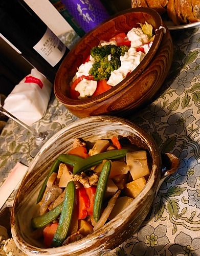 お義母さんお手製の煮物とサラダ