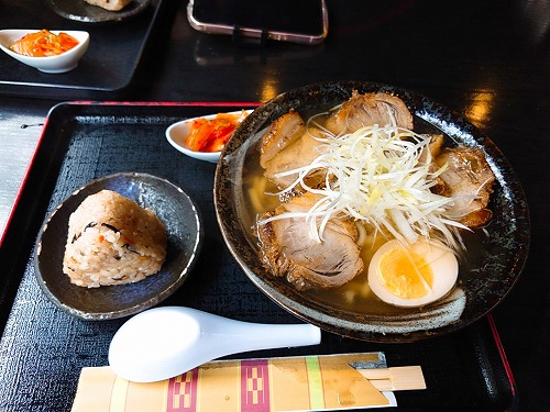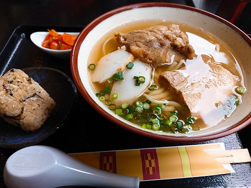 私は、大家そば(三枚肉とソーキ肉のミックスそば)とじゅーしーおにぎりのセット